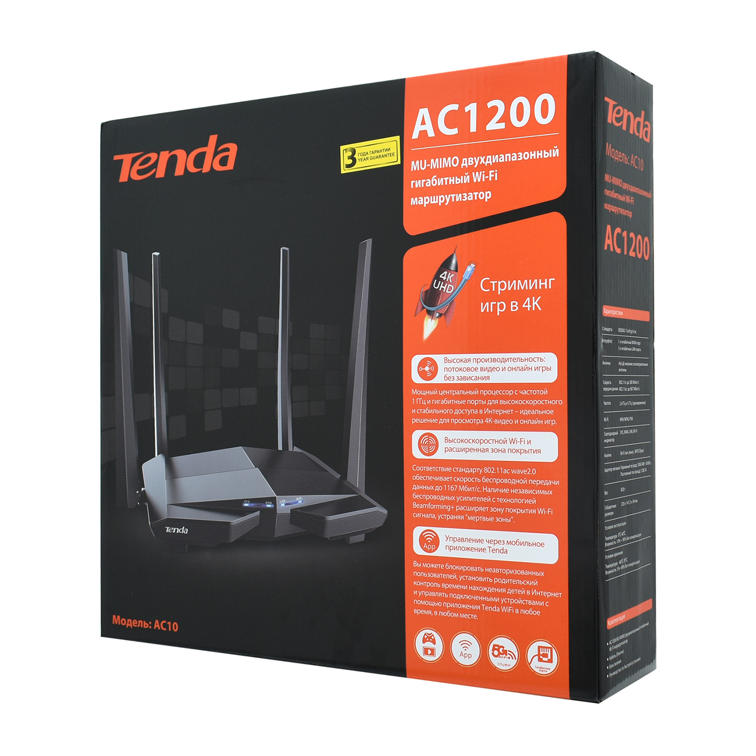 Беспроводной маршрутизатор Tenda AC10 Wireless router, WiFi 5 (AC1200M), (3+1) x 10/100/1000M
