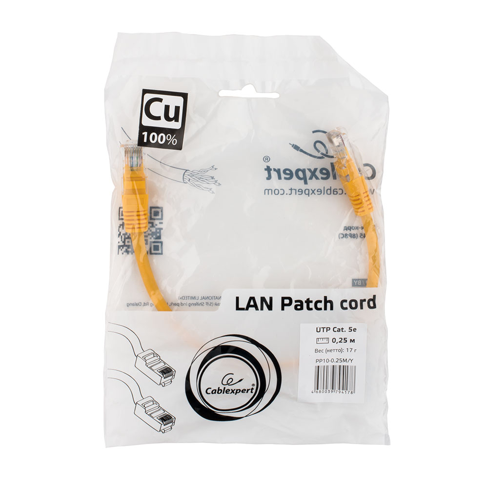 Патч-корд Cablexpert PP10-0.25M/Y, желтый Cable Patch cord UTP 5e-Cat 0.25 m