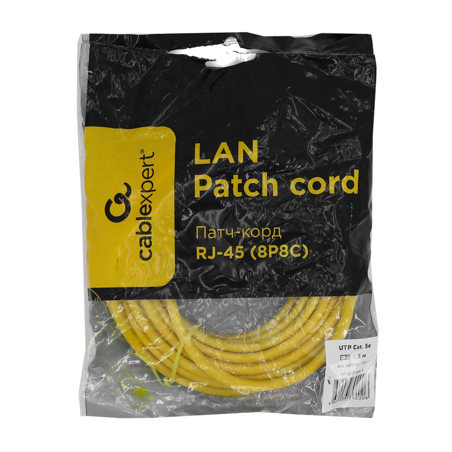 Патч-корд Cablexpert PP12-7.5M/Y, желтый Cable Patch cord UTP 5e-Cat 7.5 m