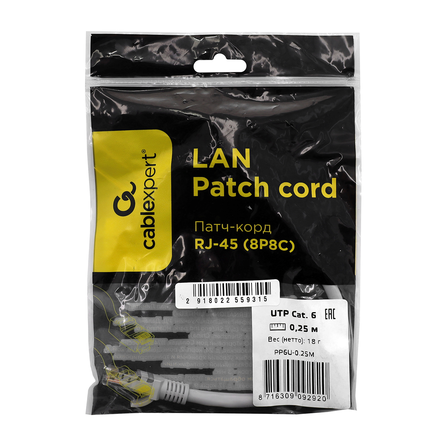 Патч-корд Cablexpert PP6U-0.25M, серый Cable Patch cord UTP 6-Cat 0.25 m