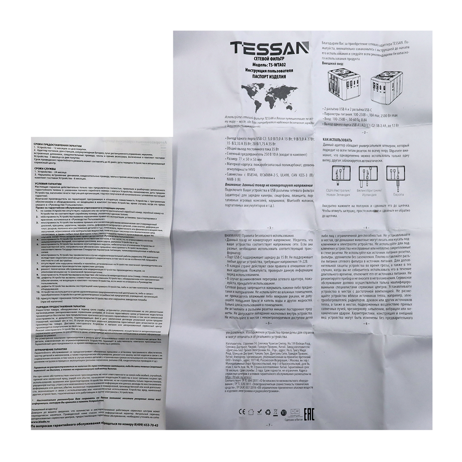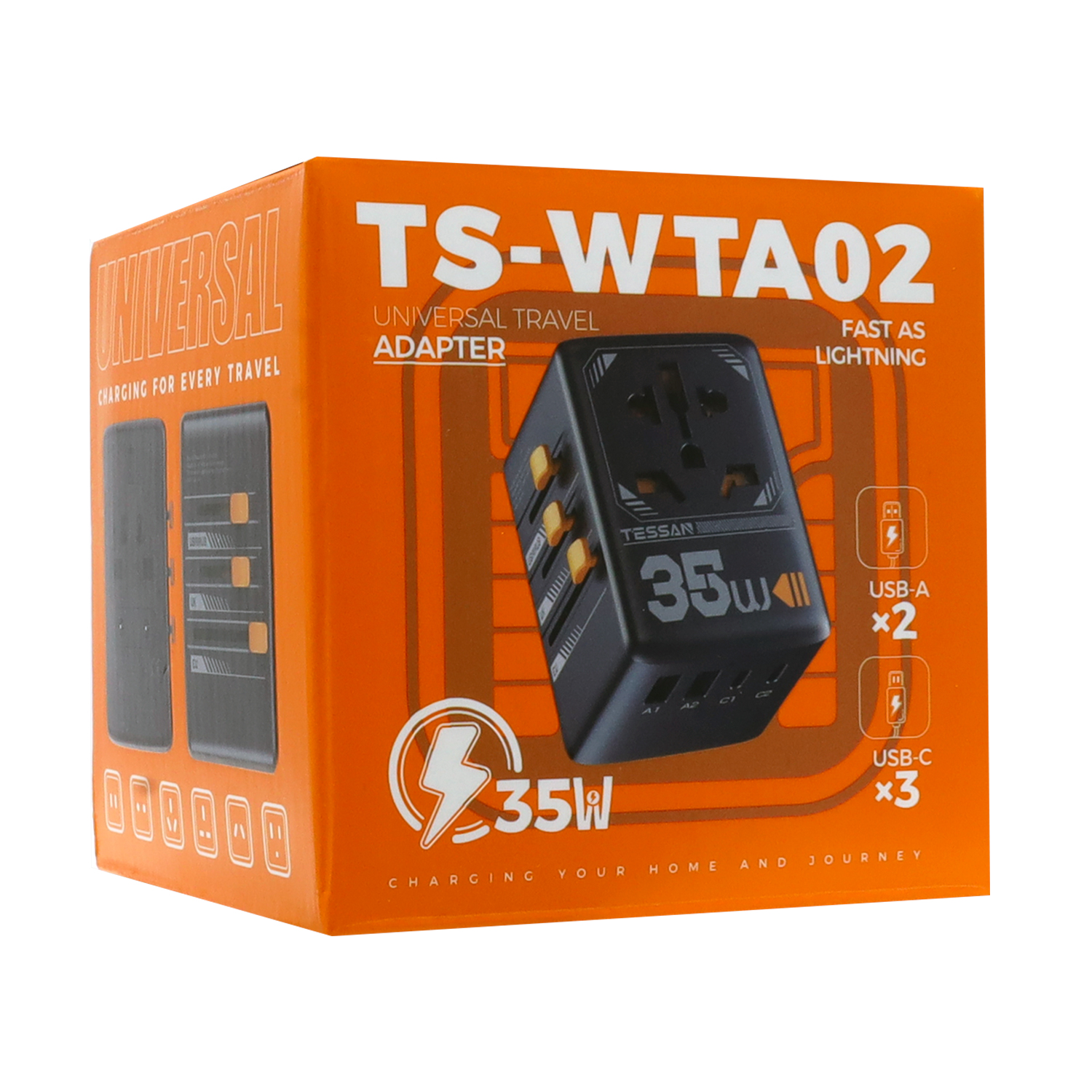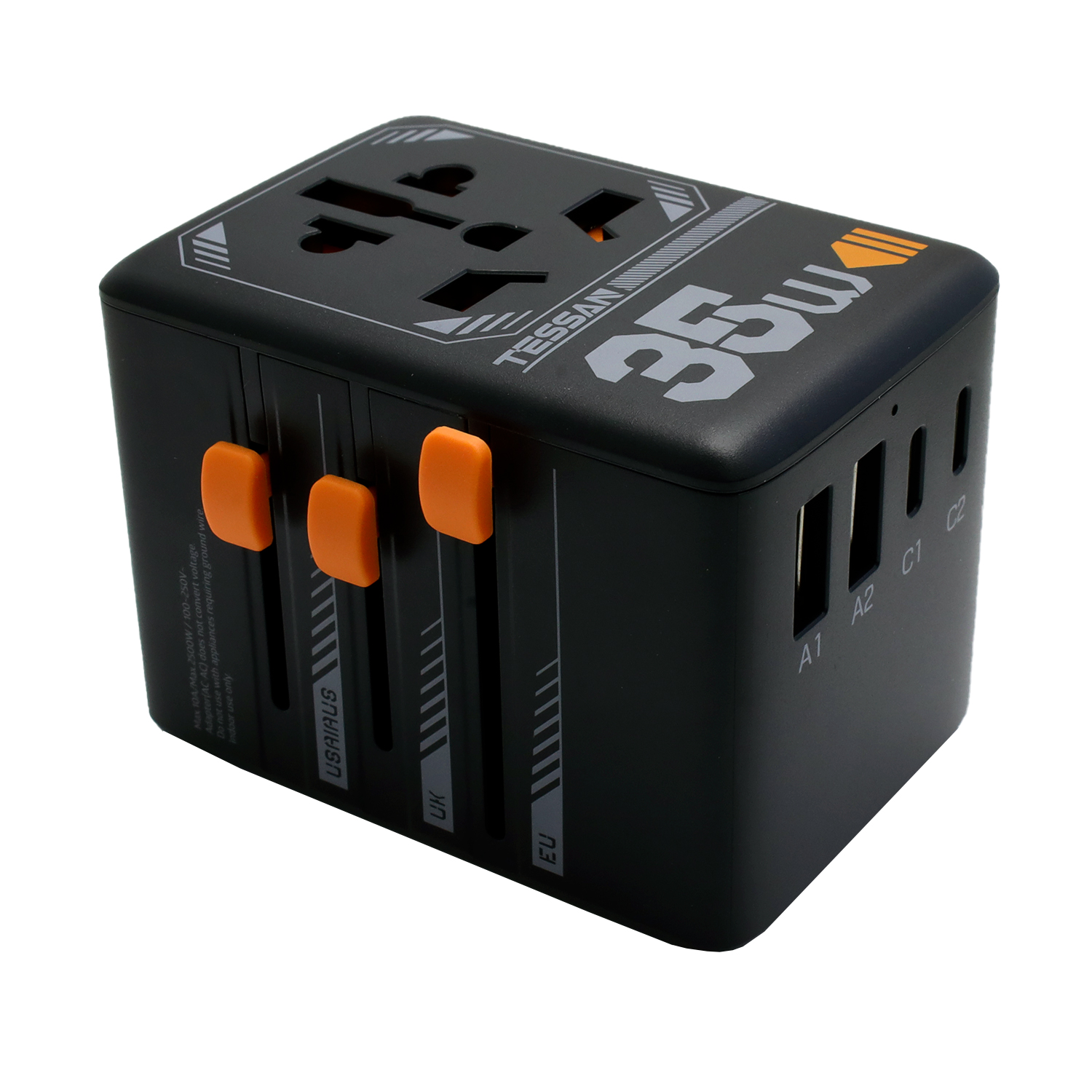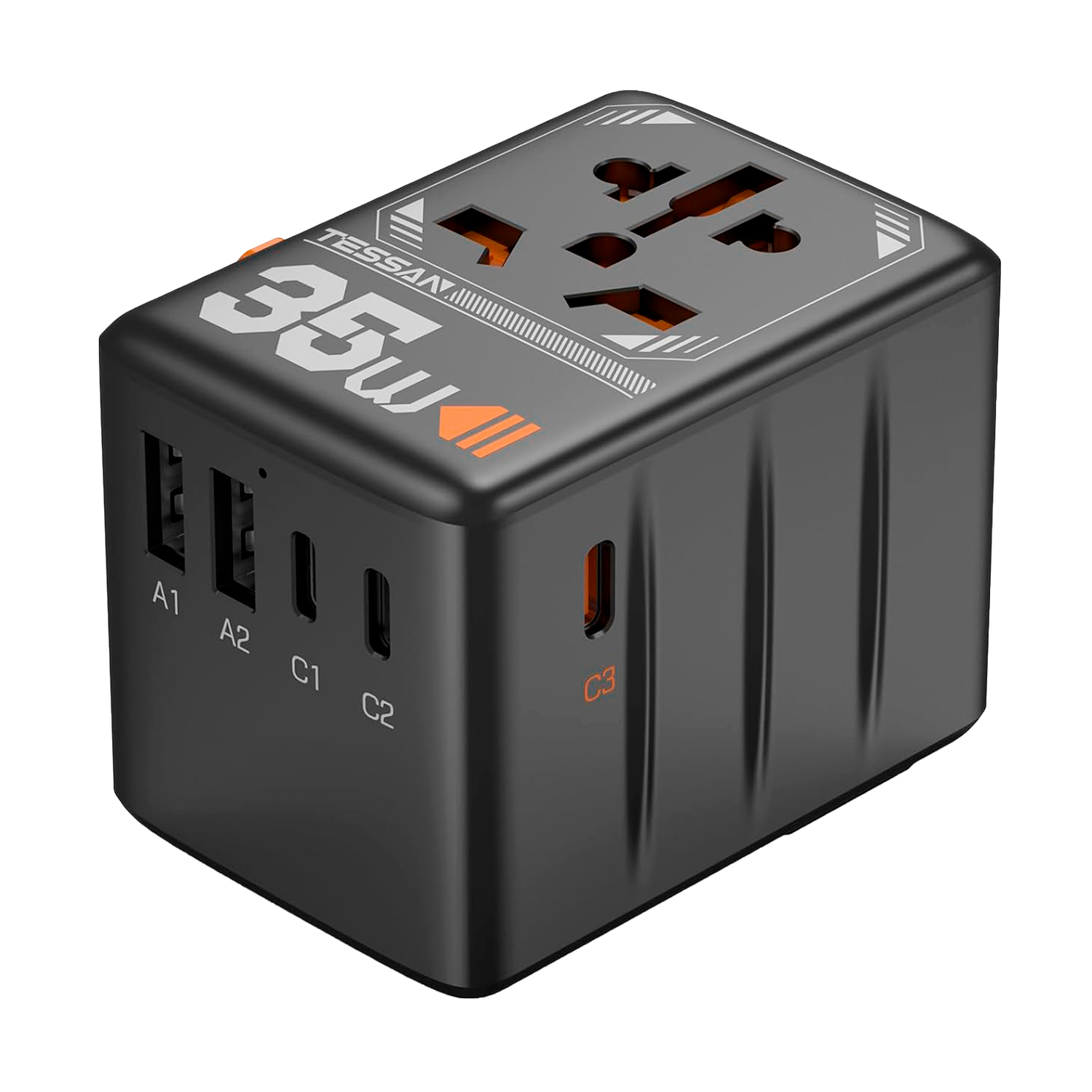 Универсальный адаптер + зарядка Tessan TS-WTA02, Чёрный 1 мультирозеткa 10A, 3USB-C + 2USB-A 35W max, black